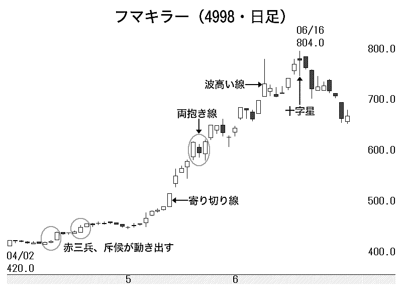5月29日の「捨て子線」、6月1、2日の「空」などを経て、佳境入りを象徴するのが、8日に出現した「波高き線」だ。上ヒゲがあまり長いとひっくり返りかねない。危なっかしい足取りである。基本は伸力減衰の証拠。直後の3本「はらみ線」が微妙な形勢変化を物語る。